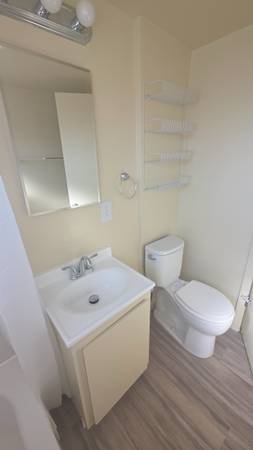 This quiet single story 1 bedroom apartment looks like a mountain cabin with new plank floors throughout, soaring 7 to 11 foot high wood-beamed ceilings and kitchen wood cabinetry also with air conditioner and washer/dryer hookups in the kitchen. Stop and see the light and airy rooms, spacious closet in bedroom and with linen closets in the hall. Gas cooking, gas heating and gas water heating help to keep utilities expense low. Off-street parking outside the kitchen door.