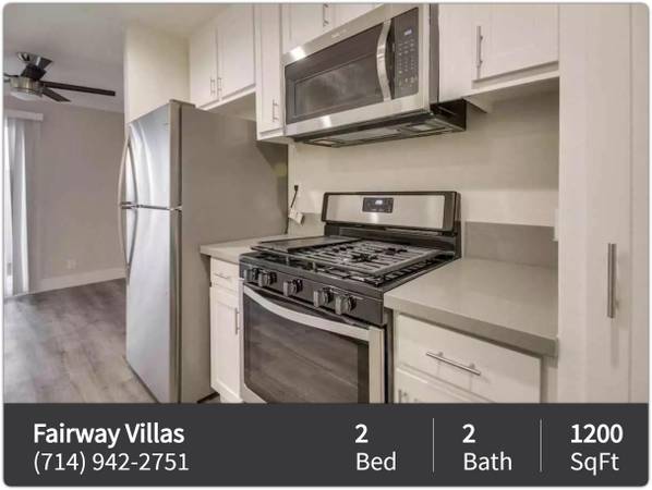 Description........ Experience the tranquility of boutique apartment living at Fairway Villas Apartment Homes. Conveniently located in Newport Beach near Eastside Costa Mesa, a short distance to award winning restaurants, shopping, entertainment and breathtaking nature trails. Choose one of our newly remodeled single story 2 bedrooms or our spacious 3-bedroom two story townhomes with private backyard. Our stunning renovation includes quartz countertops, stainless steel appliances, upgraded cabinetry, custom two-tone paint, and plank flooring.Imagine the privacy of growing a garden in your very own backyard and the convenience of washer/dryer hooks ups. Our BBQ area is the perfect place to unwind and prepare a meal to take back home or enjoy by our playground. If you want a night off of cooking come down to our Taco Night, held twice a month.
