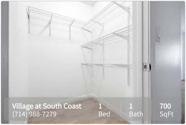 At The Village at South Coast you will discover a community conveniently located in a tranquil park-like setting, just steps away from the fast-growing area of Costa Mesa (Sobeca) and The South Coast Metro, enjoy live theatre at nearby South Coast Repertory or the Orange County Performing Arts Center. We are a short walk from The Lab, The Camp, South Coast Plaza, and Metro Pointe's many boutiques, specialty shops, and restaurants. We are next to the 55, 73 Toll, and the 405 freeways, placing you just minutes away from John Wayne Airport, shopping, entertainment, and walking distance to schools.