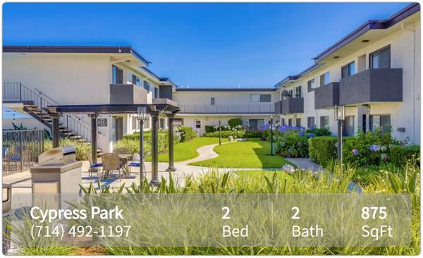 Breathe easy and take a moment to enjoy a good book at your leisure under one of our mature Cypress trees; and soak in the beauty of nature with views of our well-manicured lush landscaping. Whether you'd like a quick get-away to Los Angeles or enjoy Orange County's jewels, Cypress Park is a stone's throw away from major highways, 22, 5, 91, 405, & 710. With many entertainment options, Cypress Park is a great location for visiting friends and family located near Disneyland Resorts, Knott's Berry Farm, Buena Park Race Way, Medieval Times, and Sky Thrills. Adventure is just outside your door step!