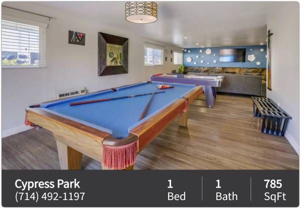 Description: Breathe easy and take a moment to enjoy a good book at your leisure under one of our mature Cypress trees; and soak in the beauty of nature with views of our well-manicured lush landscaping. Whether you'd like a quick get-away to Los Angeles or enjoy Orange County's jewels, Cypress Park is a stone's throw away from major highways, 22, 5, 91, 405, & 710. With many entertainment options, Cypress Park is a great location for visiting friends and family located near Disneyland Resorts, Knott's Berry Farm, Buena Park Race Way, Medieval Times, and Sky Thrills. Adventure is just outside your door step!
