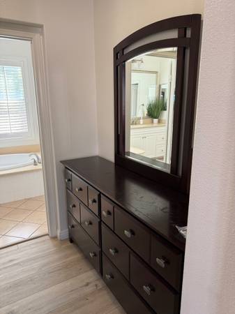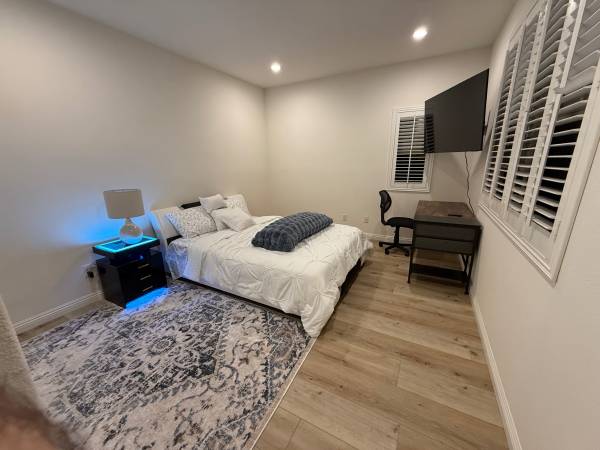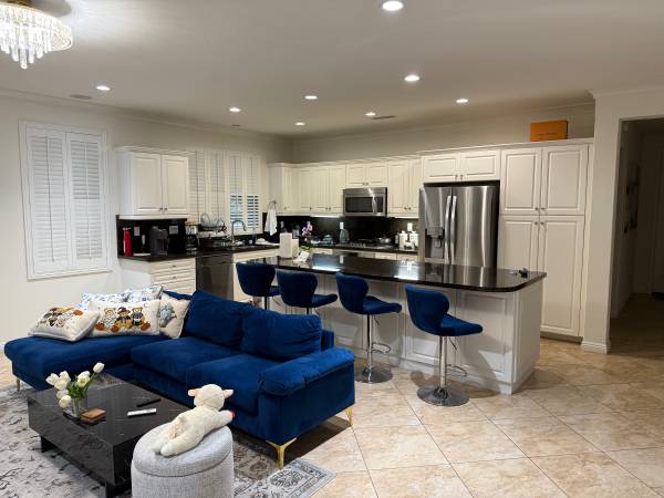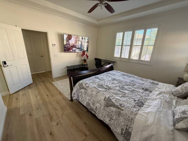 House with 4 bedroom,3 full bathroom,fully furnished,full kitchen,laundry room,5 smart tv,rooms with desks and chairs,2 car garage,backyard with furniture with grill,community swimming pools and jacuzzi,workout saloon,front of big park with basketball courts and grill place.