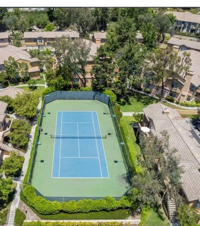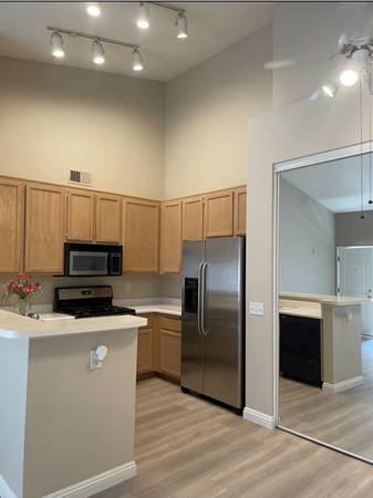 This beautiful gated upper lever 1br condo is located in a very nice community of Tuscany in Foothill Ranch, Lake Forest. It has 2 pools, a tennis court, a gym and a big club house. Beautiful newly installed water prove laminate flooring though out. The kitchen has a gas newer range, a microwave oven, a garbage disposal , a dishwasher and a nice newer fridge. Central air conditioning/heating and Cox cable ready. Living room has beautiful vaulted ceiling with designer paint, nice lighting and a ceiling fan . There is plenty of space for linen and storage in this condo. The nice sized bedroom has a huge walk- in wardrobe . The full sized washer and dryer are installed inside a cabinet at the spacious entry which you have a view of trees. Plenty of sun lights in this condo and it is away from all noise with daily security patrol, it is very safe while near everything you need at the same time . Enjoy your life with style in this private condo!
