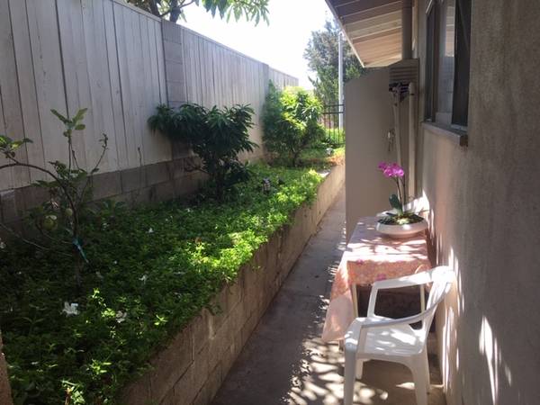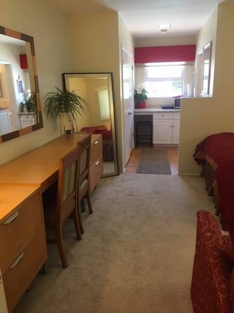Separate entrance with NO shared space. FULLY FURNISHED as shown. Enter through your own private, locked gate into a small garden patio. Very private with no access to the main house. Master bedroom studio, beautifully furnished and ready for immediate occupancy. Queen pillow top bed, large desk area, and 2 chests of drawers. Seating area with 51" flat-screen TV with cable included. Kitchenette with microwave, induction cook plate, full-size refrigerator. This is not a room for someone who likes to cook large, fancy meals, no oven. There are 2 large closets with interior lighting. Private bathroom with 2 sinks and a shower, no tub. Very small washer, spin dryer. Includes 2 fire alarms, carbon monoxide detector, and 2 fire extinguishers. Very small patio and garden behind your private gated entrance.
