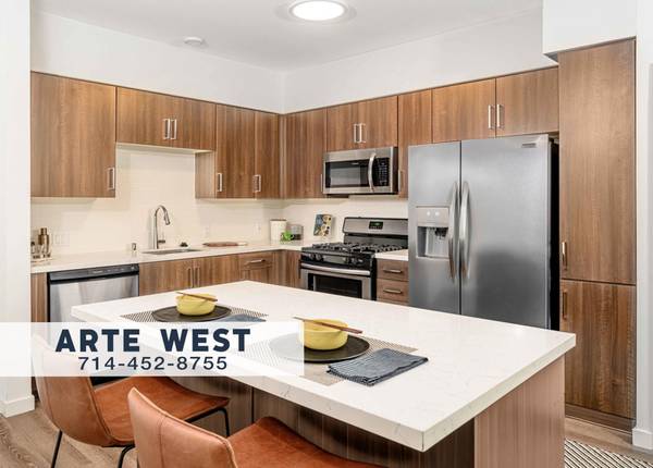 Arte West offers a sophisticated living experience in Orange County, featuring upscale amenities and stylish design elements. The pet-friendly community boasts private balconies or patios where residents can enjoy the dazzling mountain views. Inside the fully upgraded apartments, residents benefit from Frigidaire washer and dryer units, high-efficiency heat and AC, and plush carpet in the bedrooms for added comfort. The kitchen features quartz countertops, Frigidaire stainless appliances, a kitchen island, and Euro-style cabinets for a sleek aesthetic.