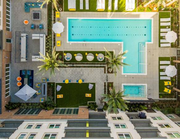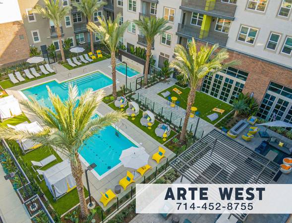 The indoor/outdoor lounge with game tables is perfect for socializing, while the private co-working nook provides a quiet space to get work done. The secure access and professional, on-site management ensure a comfortable and stress-free living environment for all residents. Whether you're lounging on your private balcony or patio, relaxing in the oversized soaking tub, or cooking in the gourmet kitchen with quartz countertops and a kitchen island, Arte West Apartments offer the perfect blend of luxury and convenience in OC.