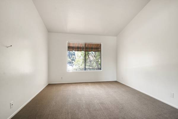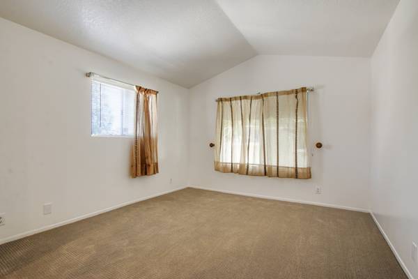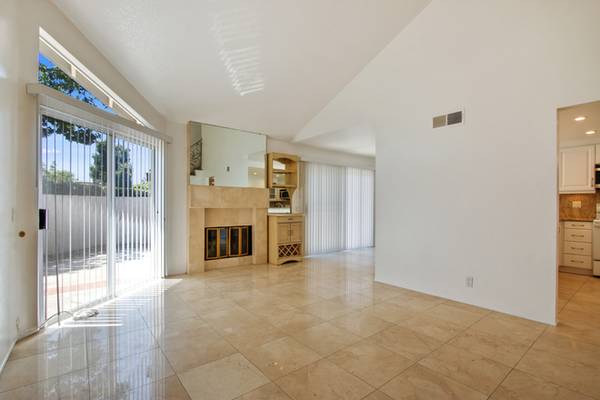 Spacious living room w/ vaulted ceilings, granite fireplace, and built-in cabinet.