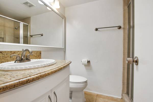 Main floor bedroom and bathroom. Granite flooring downstairs and upstairs in bathrooms.