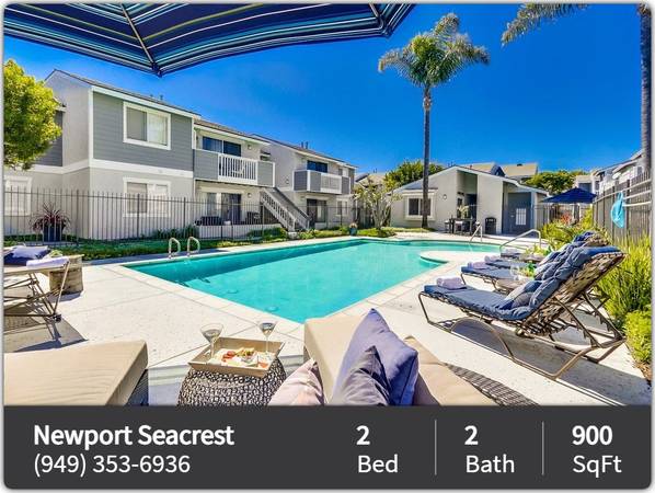 Welcome Home to Newport Seacrest Apartment Homes. Live in one of the most prestigious neighborhoods; walking distance to the ocean in the heart of Newport Beach. Enjoy the cool ocean breeze from the patio of your Newport Seacrest Apartment. Everything you ever wanted from beach living is just down the street: go surfing, walking, jogging, cycling, or sun bathing. Your surrounded by world class restaurants, shopping, and entertainment.