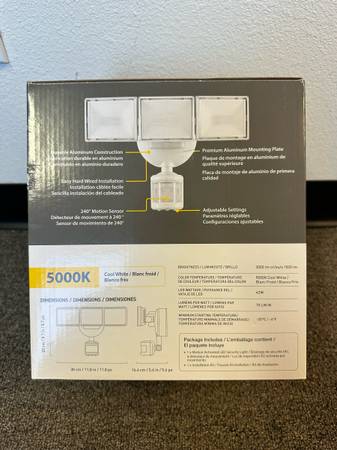 Brand new KODA LED motion security floodlight. Triple head adjustable LED. 3000 lm / 1500 lm adjustable brightness, 5000K cool white. Hardwired install. 240° motion sensor up to 68 ft. Great for driveway / backyard / side yard security.