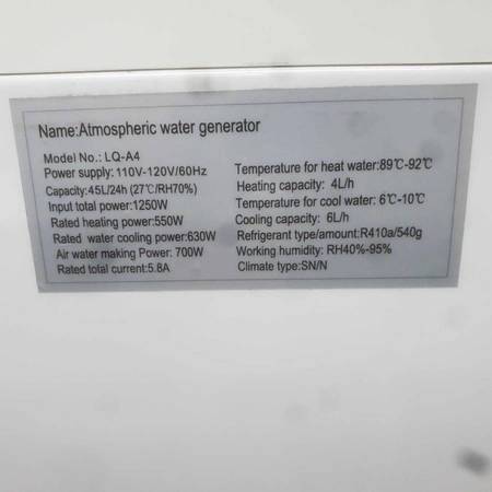 Never pay for bottled water again! Drink pure clean and magically created water from thin air! This is an Atmospheric water Generator machine model 12 Gal / Day Purifier Evaporator Model #A45 Atmospheric Water Generator. Has built in Reverse Osmosis filtration system making the purest water ever!