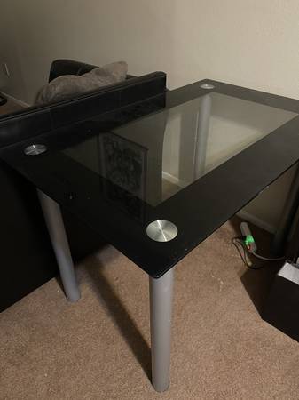 ELEGANT RECTANGULAR GLASS TABLE Nickel-chrome steel legs, rectangular beveled glass 43,5’ x 27,5’ Excellent condition