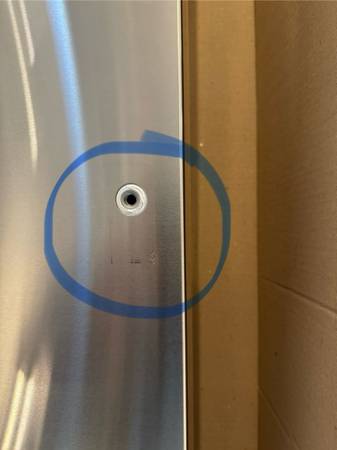 No dents, but one scratch (see pics) that may be able to be buffed out - not deep. There is another blemish that I believe will be covered up when a handle is insulted. This door also has a leaky seal. My understanding is that this is a $50 (or so) part.