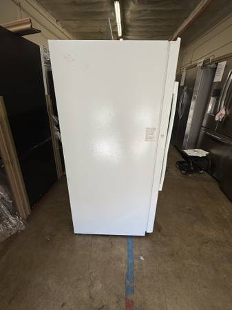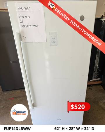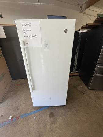 For sale: GE FUF14DLRWW upright freezer with 14.1 cu. ft. capacity. Includes adjustable shelving, frost-free performance, LED interior lighting, and a lock with key. Fully inspected, tested, and ready for immediate delivery.