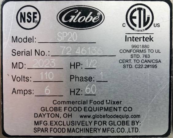 2023 Slightly Used Globe SP20 20 Qt. Planetary Stand Mixer with Guard, Stainless Steel Bowl and Spiral Dough Hook. Standard Accessories - 120V, 1/2 hp. Please text me @