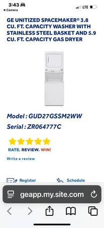 White GE washer/dryer single stacker unit. 2 years old. Great condition.