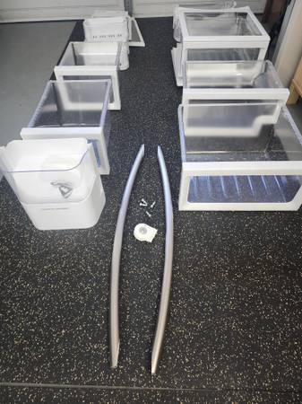 Complete set of Samsung Fridge drawer's including ice-maker door handle. 26 pieces in total including evap fan motor. Will sell separately. Fridge is gone only what's left in pictures.