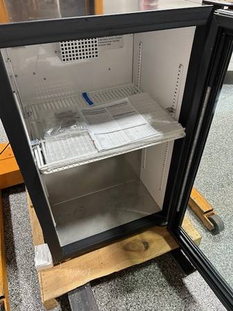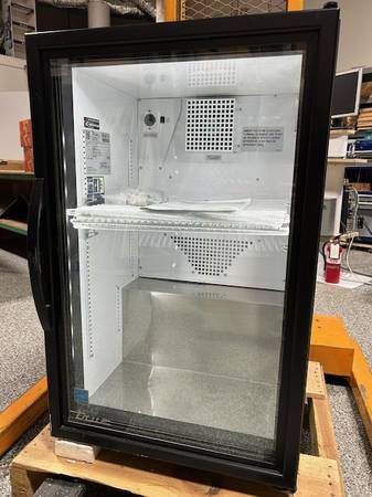 Slightly used, very low time True GDM-7 refrigerator. Works very well. Company used temporarily for sizing and testing, then kept boxed after program was over. Swinging glass door, LED light can be turned on/off. Three shelves. Energy efficient cooling with thermostat adjustment.
