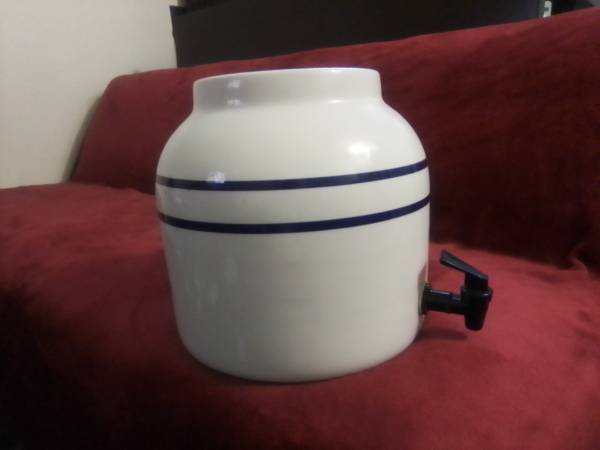White w/blue stripes 5 gallon water dispenser. In great condition. It is dishwasher safe. It is a single item. Does not come with a stand. $25