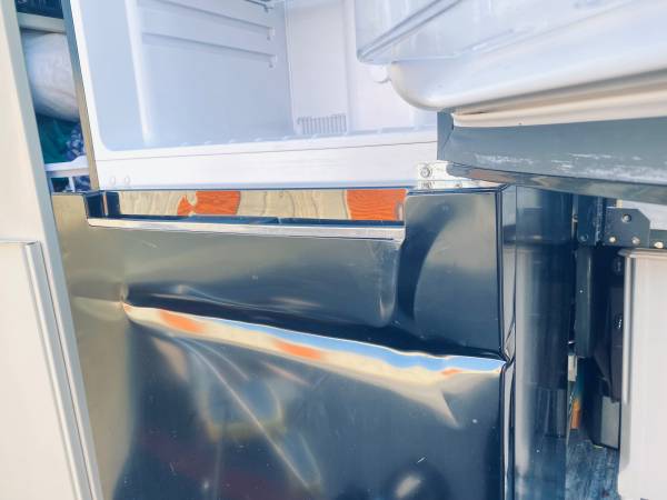 Fridge has dent across front door. Does not affect function of refrigerator at all. The refrigerator works perfect. You can put hook stickers on there and hang towels over it or you can put wallpaper over it or you can put magnet pictures over it for aesthetic contentment.. Otherwise the refrigerator works perfect. I will include a few extra Kitchen items that are not listed in the pictures here.
