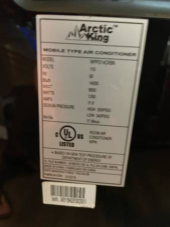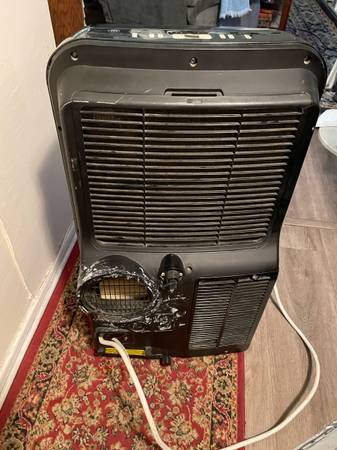 Portable air conditioning unit works fine! Used but in great condition with 14,000 BTU, cools rooms of 700 sq ft. A/C has 3 fan speeds, timer and sleep mode. NOTE: A/C does NOT come with the remote control. Remote controls are $7.00 to $40.00 online and the window vent attachment is $7.00 to $35.00 online. A/C unit works fine without the remote control but the window vent is almost necessary to keep the heat outside! Sold “as is” but please test and check it out first!