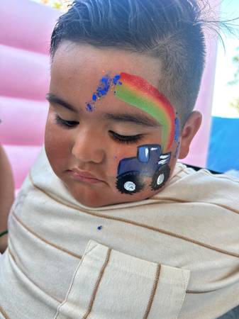 • Two Artists (Face Painting + Glitter Tattoos) – $150 per hour (minimum 2 hours). Having two artists allows one to focus on face painting while the other provides glitter tattoos, so we can serve more kids in less time.