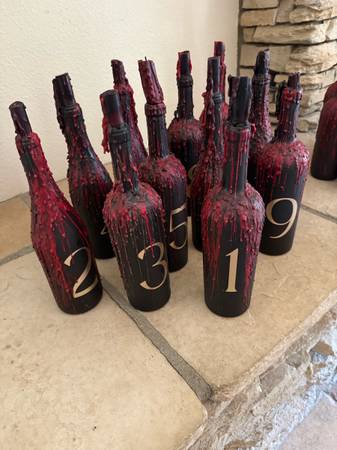11 table numbers handmade from regular wine bottles. Also have an additional 8 bottles without numbers Used for one wedding