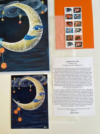 Every month I send out a 5”x7” art print of my work sent straight to your mailbox. Along with it, there is a ritual (around being present, expressing gratitude, connecting with nature, etc.) included that ties into the art print.