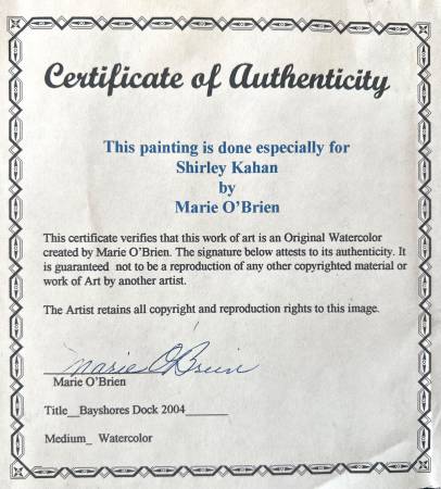 Watercolor of Bayshores Dock in Newport Beach, California by Marie O'Brien in 2004. Bayshores is a very small community of 235 homes on the water in Newport Beach harbor. Famous residents include John Wayne and Nicolas Cage. The community has a private beach with a boat dock where the residents tie up small boats and from which children fish. It is framed and mounted in a walnut colored wood frame and white matte. The frame measures 25.25" long" x 21.25" wide. The watercolor measures 13" x 9". Very good condition.