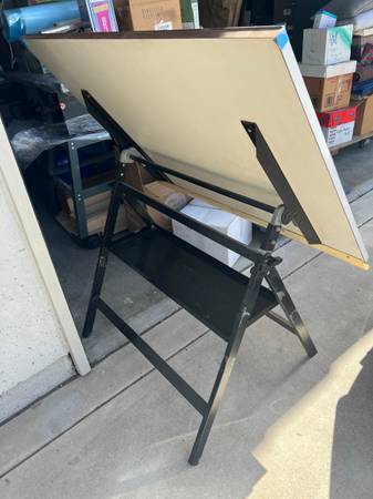 Drafting or Drawing Table. Fully adjustable Table top and height. Folds flat for storage. Supply shelf and pen or paintbrush gutter. Table top measures 42" x 31".