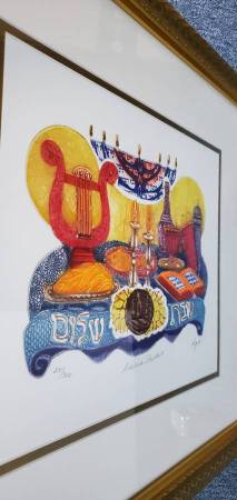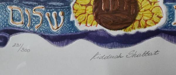 This is a Amram Ebgi limited edition hand signed color embossed lithograph with foil stamping titled “KIDDUSH SHABBOT”.