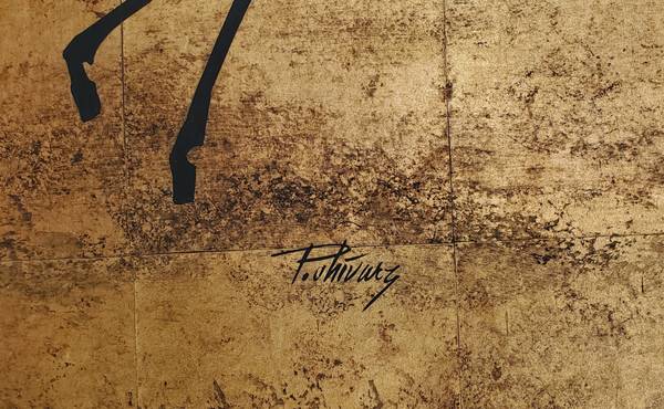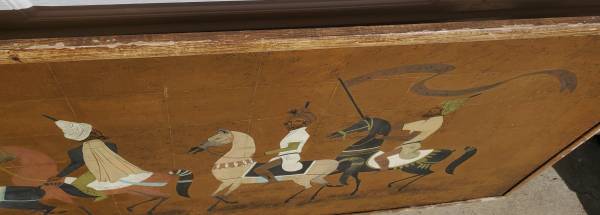 Painting appears to be done on top of gold foil or gold paper squares applied to masonite board. Thin wood frame. Some writing on the 2 banners in the painting that I can not descifer.