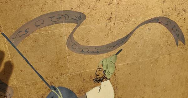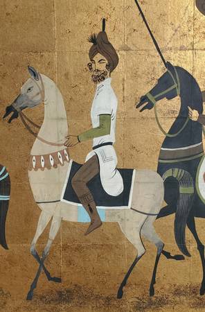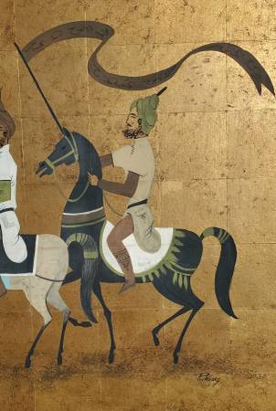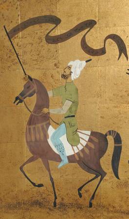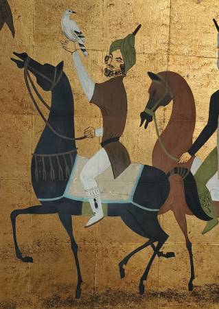Large Painting of an Arabic or Persian Royal Falconer on Horseback with His Royal Guard.