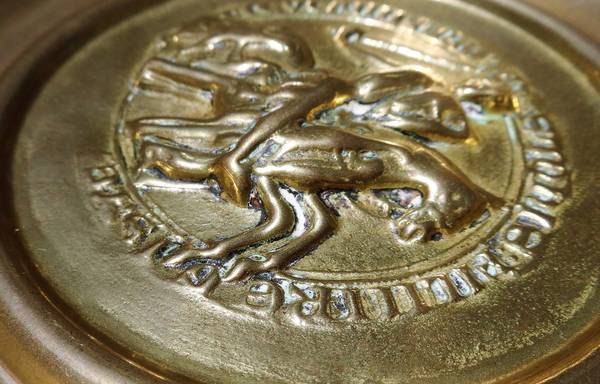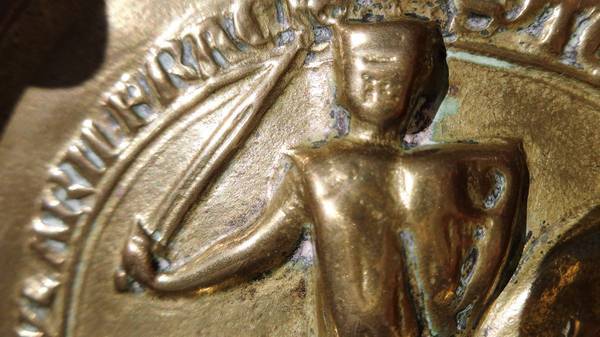 Condition: This shows hundreds of years of use with the brass/bronze being polished all the way through in a few areas and very thin in other areas. Dish remains intact with some dents and dings and only slightly out of shape. This dish has had hangers soldered to the back for hanging in a church (likely added in the late 1800's - early 1900's).