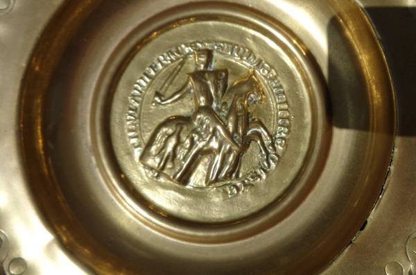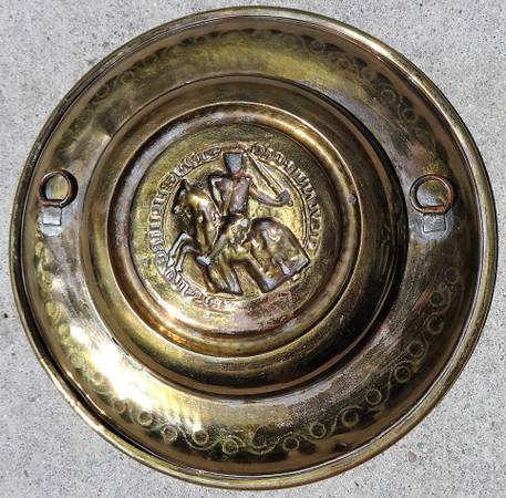 This is a very rare alms dish likely from Eastern Europe or possibly Germany. Many that still exist today come from areas of Germany, but with years of searching this coat of arms seal, I have found this most likely resembles ones from the region of Poland. The language and style of armor are that from as early as the 1200's - later 1400's. The eagle on the shield and horses Trapper or Caparison are also symbolic of Poland at the time (however, Germany also). This image would have been the seal of the "Lord of the Land" at the time and could be strictly regional, or possibly the King of all the lands at the time. I have hoped to find medieval coinage that would be an exact match, but have only found ones close in language and appearance from as early as the 1200's - late 1400's.