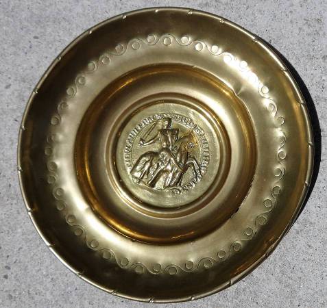 These are often/commonly referred to as Nuremberg alms dishes and this could be one from the 16th Century out of Germany representing an earlier depiction. Viewers to make their own determination on age and condition.