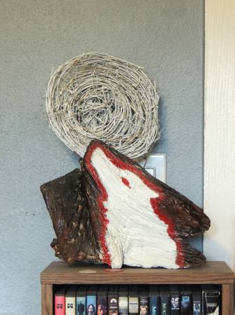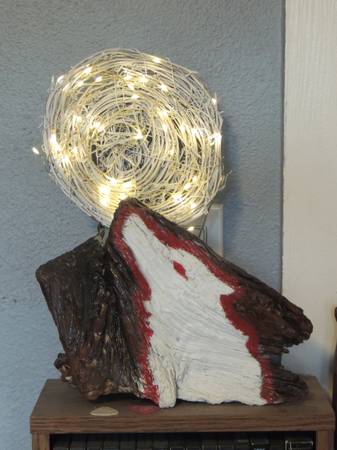A piece of driftwood I found in a dry creek bed in Reno NV. I immediately saw the image of a wolf howling from the shape of the driftwood, so I took it home and got to painting it. But why was the wolf howling, so I came up with the moon, and of course it had to light up so I added the lights last. Now it is a nightlight!