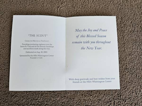 My late aunt and uncle bought this new at the Whittington Center. There is also a dedication to my uncle with Charlton Heston's ‘printed’ signature on a separate poster that was included with the artwork along with a card with info about the Santa Fe Trail and the Dedication.