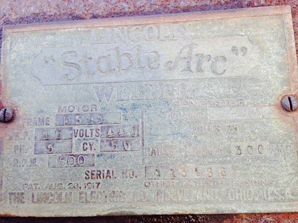 LINCOLN ANTIQUE WELDING MACHINE, FRAME D311-HP-15- VOLTS 440- PH 3- CYCLE 50- RPM 1500- RATING NEMA 300-- SERIAL # A13486 " this is NOT a working machine "