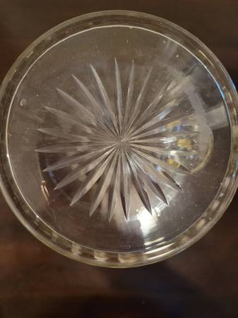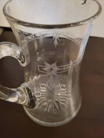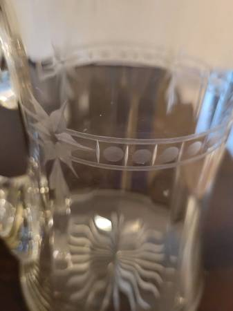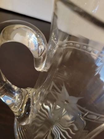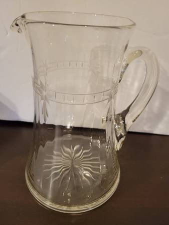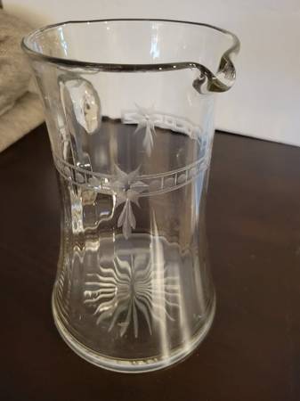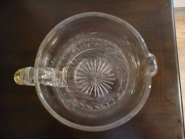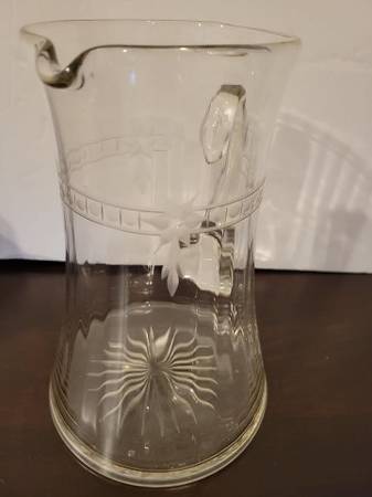 Antique American Brilliant ABP Cut Etched Crystal Glass Pitcher Jug. 8.5" high and 5.5" across the base. Has a band of etching around the pitcher 2" from the top. Starburst design cut into the base. Handle is applied. There is a bubble in the glass of the handle and a bubble in the base. A couple spots of wear on the pitcher sides and along the base. Please see photos. This is a gorgeous piece.
