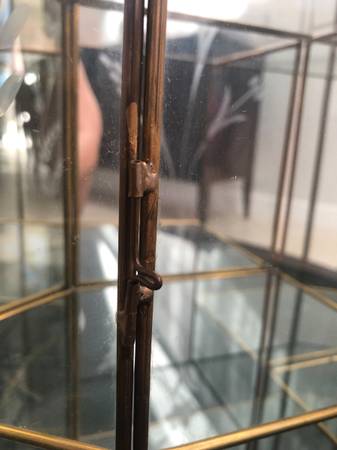 This is a 6 sided, mirrored, gilded edges with glass shelving display case. It holds small figurines or collectibles. It is 27 1/2" high, 5 1/2" deep and 19" long. Can stand by itself or be hung on...