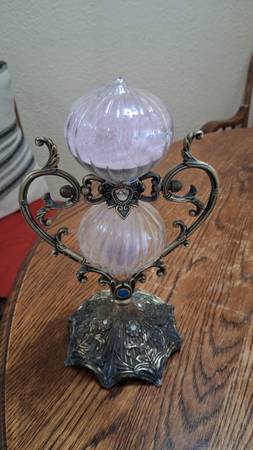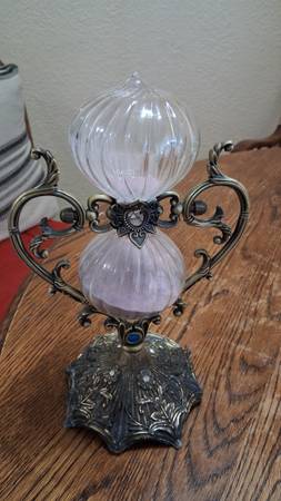 ELEGANT VINTAGE HOURGLASS WITH ORNATE METAL STAND. THE SAND POWDER INSIDE IS COLOR PURPLE. CONTACT RAMON: