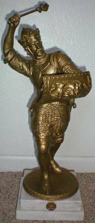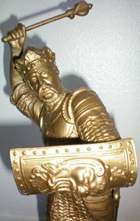 Spectacular 19th century antique art, gilt bronze, Dark Age Visigoths king (Spain predecessor) with scepter and shield in hands, 16" tall in excellent condition, very impressive details and master workmanship, super heavy.