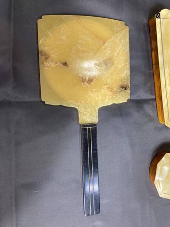 Rare! This is a real Art Deco vanity dresser set with superior design and workmanship. The rare brilliant yellow onyx and inlay design make them signature pieces of Art Deco. All in excellent...