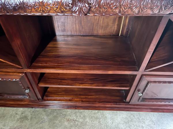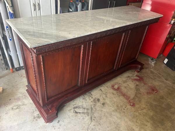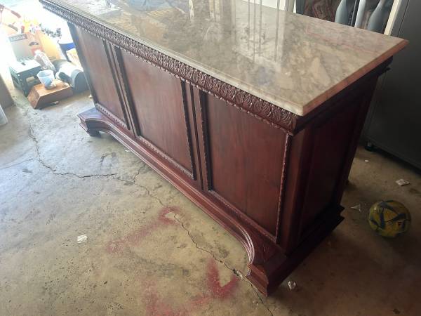 Antique Bar para casa Color: Caoba Con parte superior blanca de marmol, Con 3 cajones 2 cabinetes para almacenaje con puertas, 2 areas para almacenar botellas, Al ccentro 3 repisas. $400 Solo efectivo (cash) oh Venmo, Zelle. El precio regular en este Bar en las tiendas de Antique es alrededor de $2800. desgraciadamente ya no tengo espacio para ello por eso lo pongo en venta.