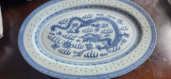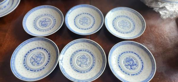 Set 7 Vintage Jingdezhen Rice Eyes Blue & White Plates with Dragon Design, 8” 2 rice bowls about 4 1/2 diameter 1 Chinese oval platter 12" take all great condition located in fountain valley CA...