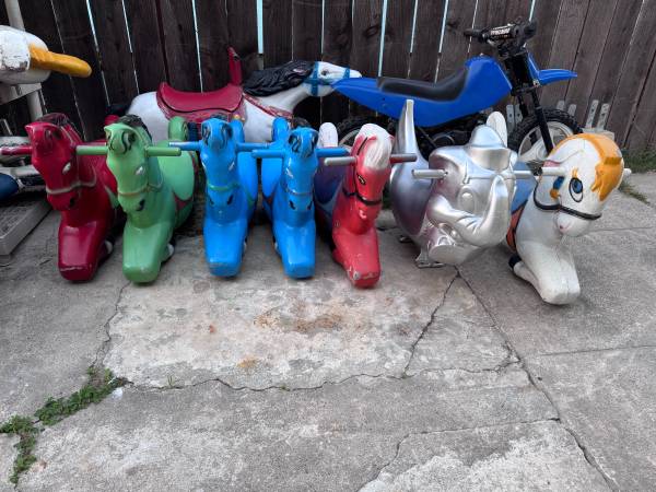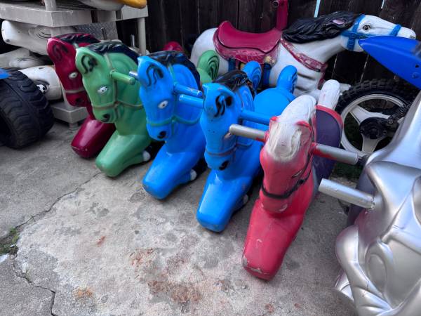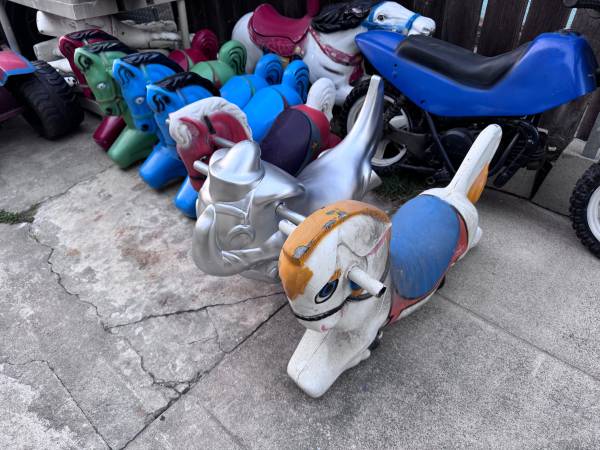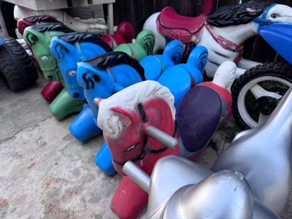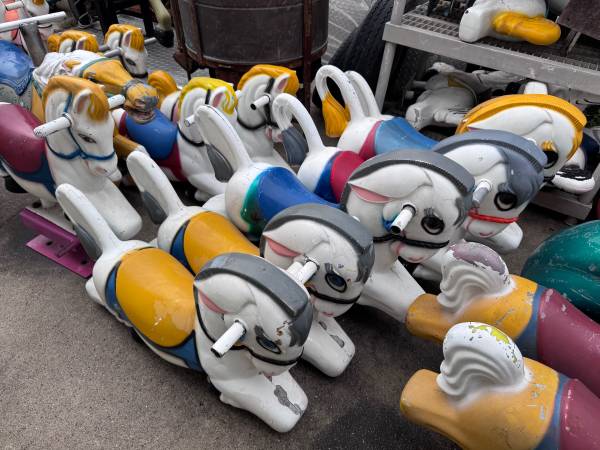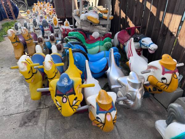 We have 50+ carousel horse’s and animals from the 1960’s, some are made of plastic and some are made of metal from the coin operated carousel kiddie ride that were seen in front of stores. They are in the city of Garden Grove and some are in Ramona.