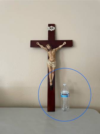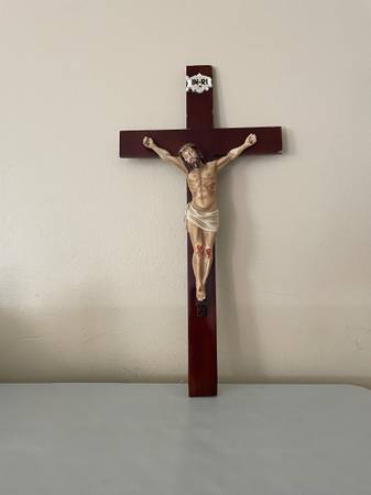 714 two 3093 eight 0 $ 65 Firm Pickup - Bottle photographed for size reference Around 29” Large Wood Cross Crucifix Chalkware ?? Corpus Jesus Christ INRI Plaque