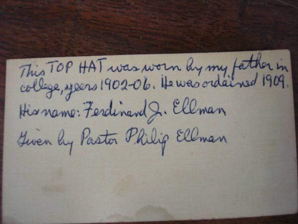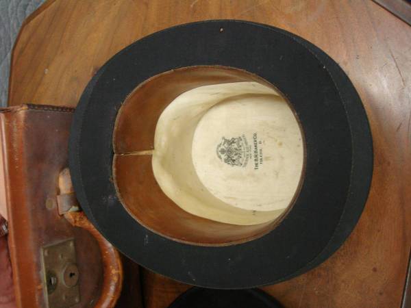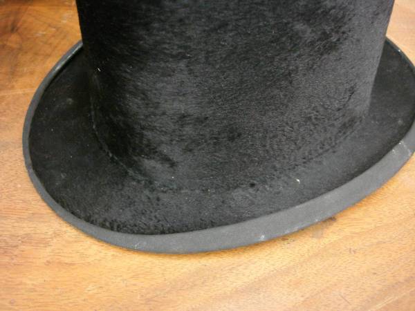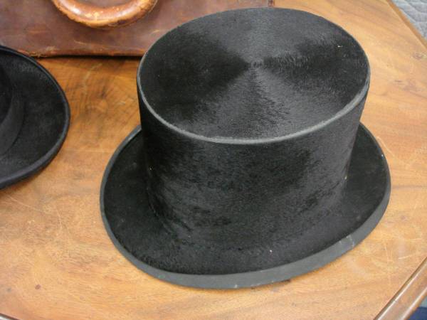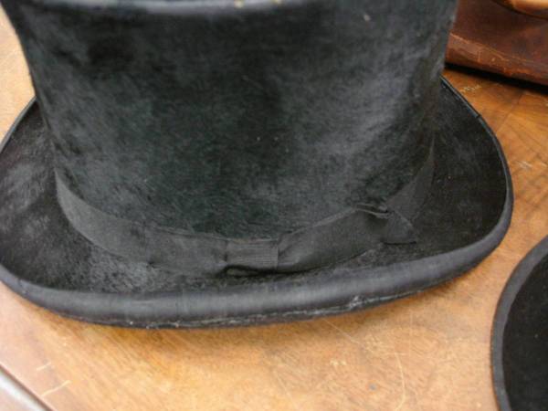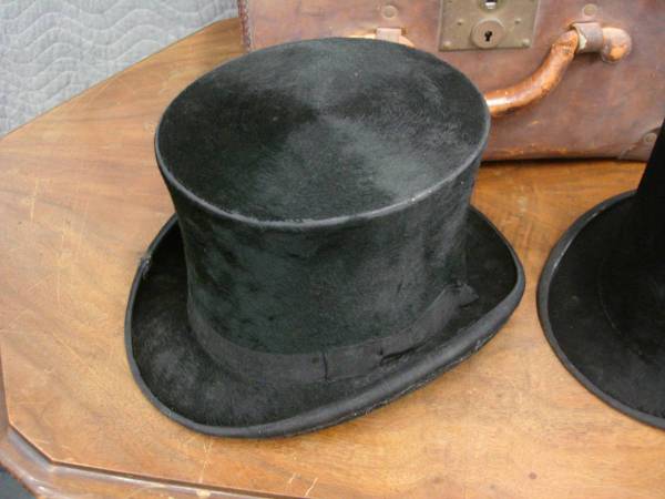 2 turn of the century beaver top hats. The one on the left side in the first picture is approximately a size 7 1/8" or so and was made in Paris. It had a card in it (as shown in another picture) mentioning it was worn from 1902 to 1906.