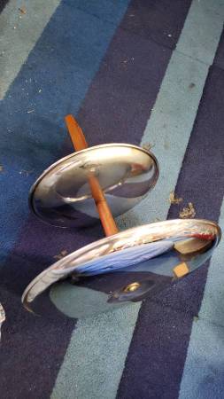 Wood and metal vintage 2 level snack tray, candy dish, serving tray. Measures about 10" tall and the top tray is about 6 1/2" in diameter and the bottom one is 8 1/2".